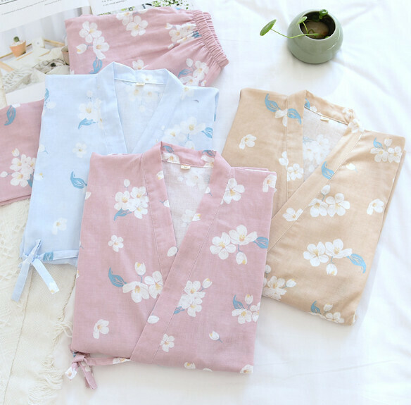 新款春秋季薄款全棉紗布和服睡衣(LH淺藍櫻花)【M-XL碼】【下單後聯絡客服確認發貨尺碼】