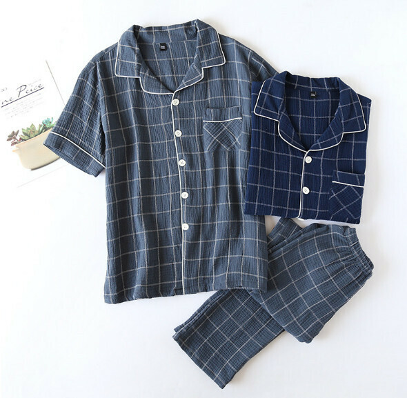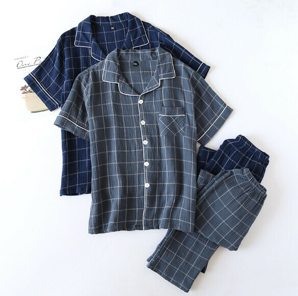 熱賣春夏季紗布短袖長褲睡衣套裝(H男款藏青線格)【M-XL碼】【下單後聯絡客服確認發貨尺碼】