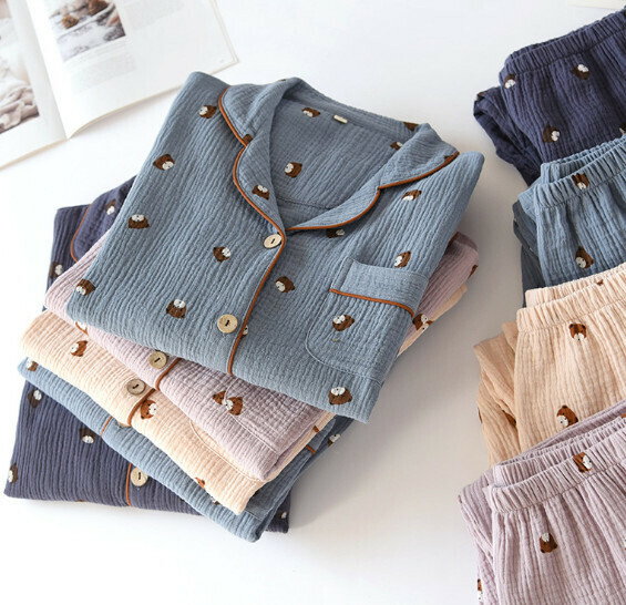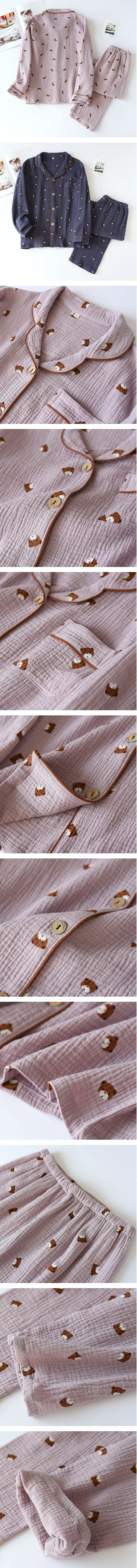 熱賣春夏款長袖棉紗縐布睡衣套裝(LH紫色小熊)【M-XL碼】【下單後聯絡客服確認發貨尺碼】