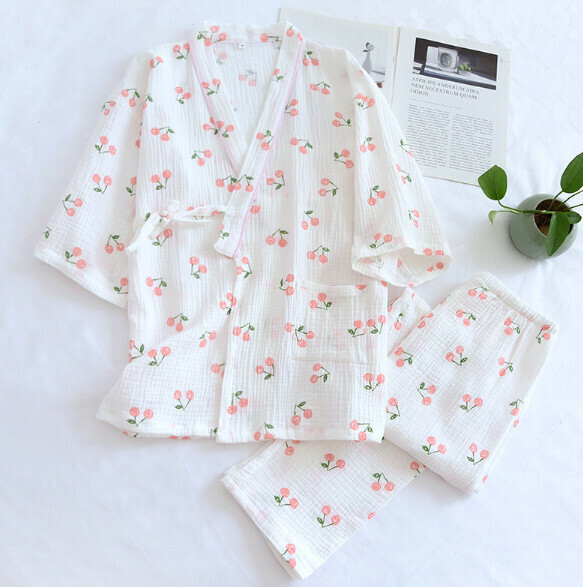 激抵春夏季七分袖純棉紗布和服睡衣(ZHY白底櫻桃)【M-XL碼】【下單後聯絡客服確認發貨尺碼】