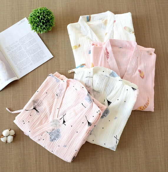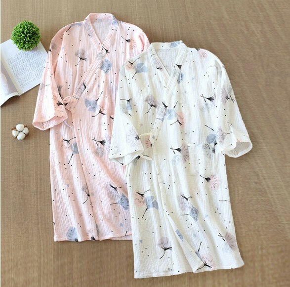 熱賣春夏秋季全棉縐布紗布和服睡袍(LH白色銀杏葉)【M-L碼】【下單後聯絡客服確認發貨尺碼】