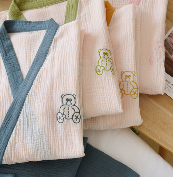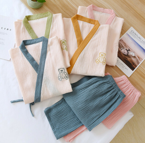 爆款春夏季拼色壓邊縐布和服睡衣(SXL藍色)【M-XL碼】【下單後聯絡客服確認發貨尺碼】