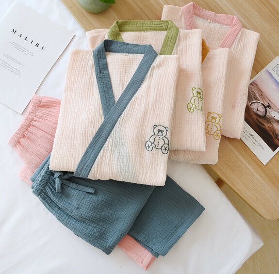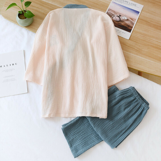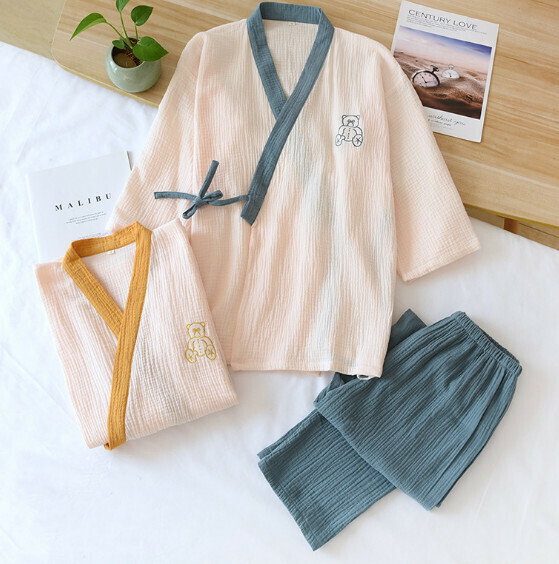 爆款春夏季拼色壓邊縐布和服睡衣(SXL黃色)【M-XL碼】【下單後聯絡客服確認發貨尺碼】