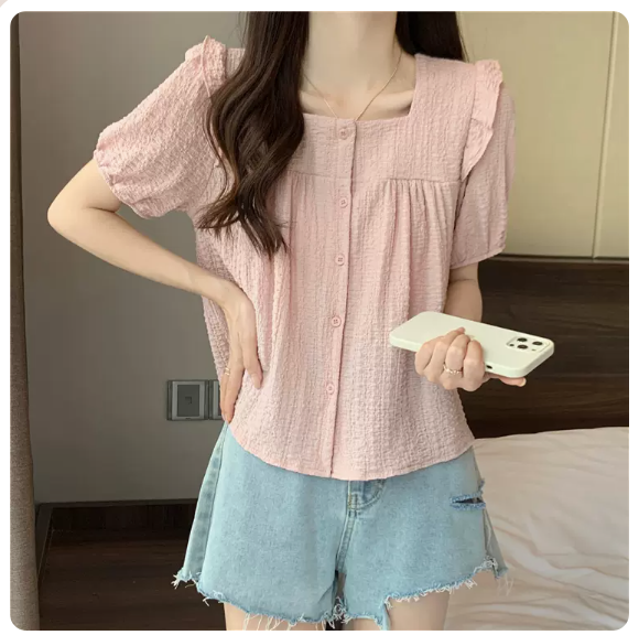 熱賣方領木耳邊短袖襯衫(粉色 尺碼:S-3XL)(下單後請聯絡客服確認發貨尺碼)