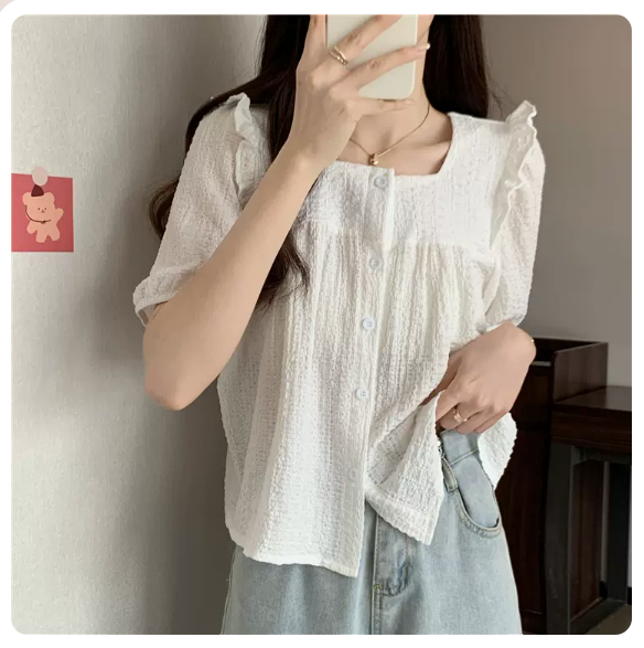 熱賣方領木耳邊短袖襯衫(白色 尺碼:S-3XL)(下單後請聯絡客服確認發貨尺碼)