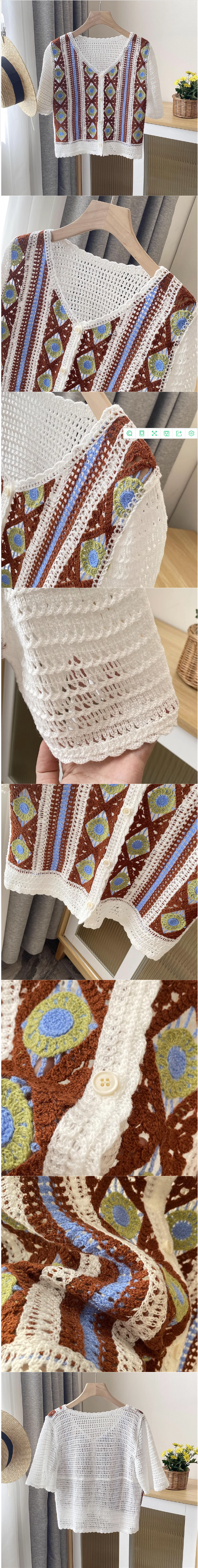 條紋繡花上衣V領短袖單排扣鏤空衫