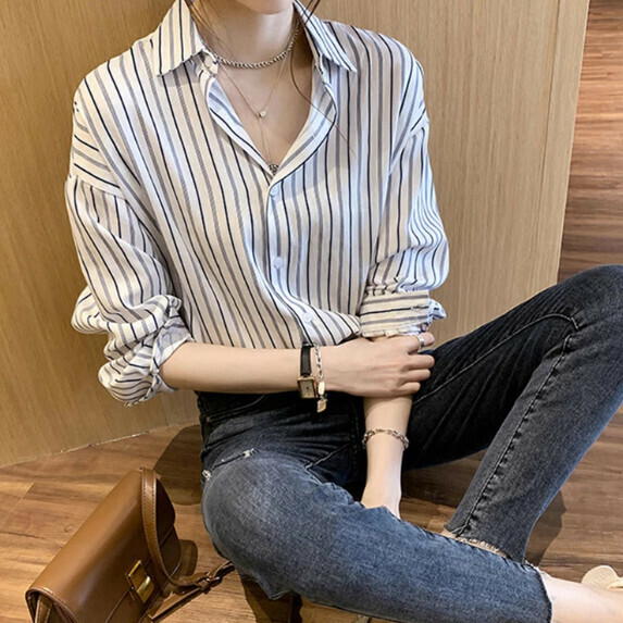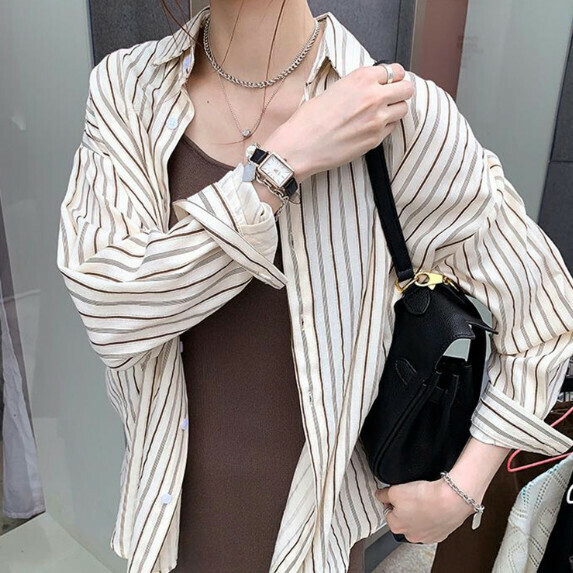 新款條紋襯衫女秋季(杏色【S_XL碼】(下單後聯繫客服確認發貨尺碼)
