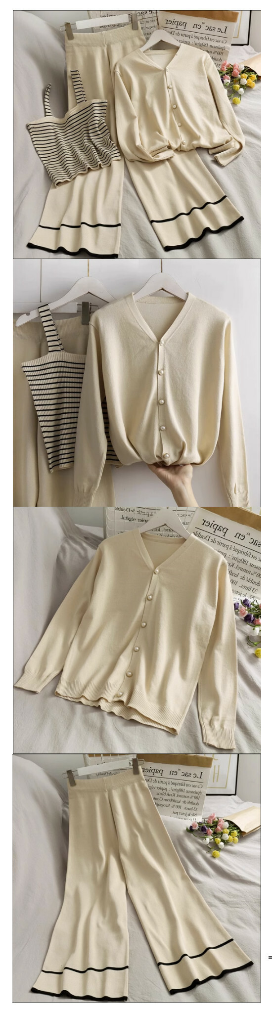 條紋短款吊帶V領單排扣針織外套闊腿褲三件套