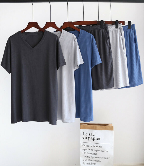 熱賣夏季提花坑條V領短袖短褲睡衣套裝(LZQ黑色)【M-XXL碼】【下單後聯絡客服確認發貨尺碼】