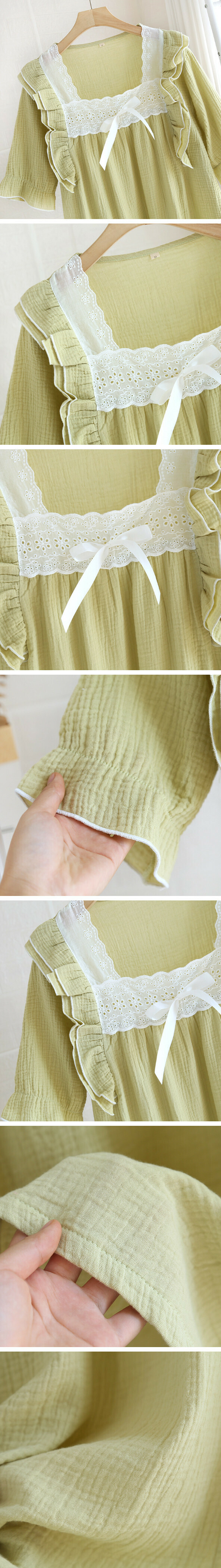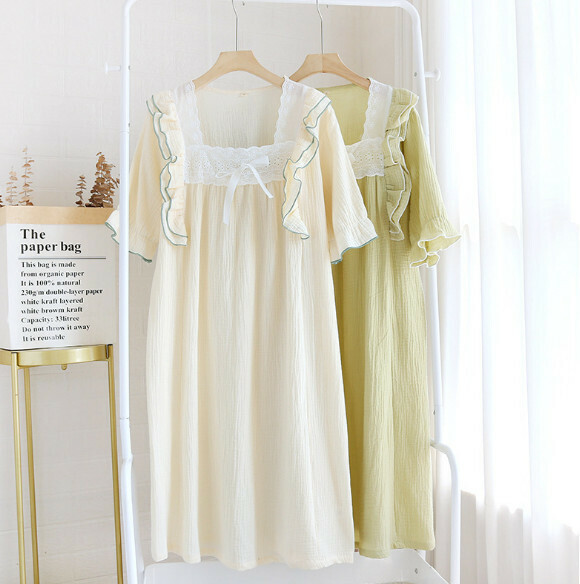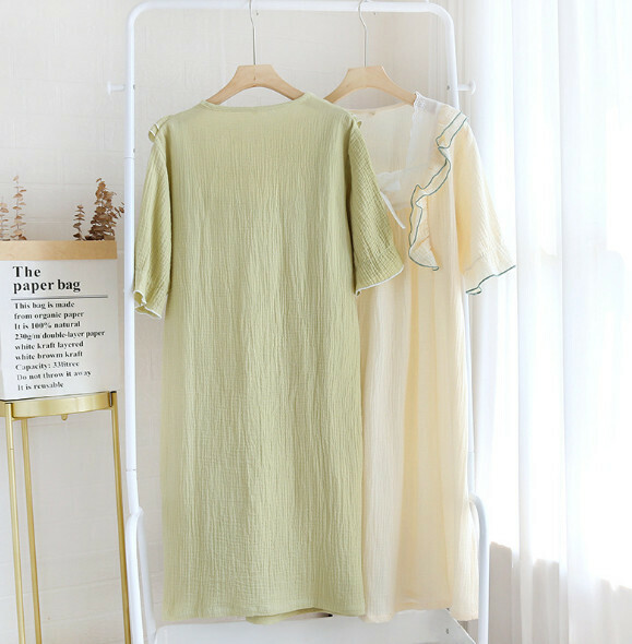 新款夏季蕾絲邊飄帶縐布短袖睡裙(LYZ綠色)【M-XL碼】【下單後聯絡客服確認發貨尺碼】