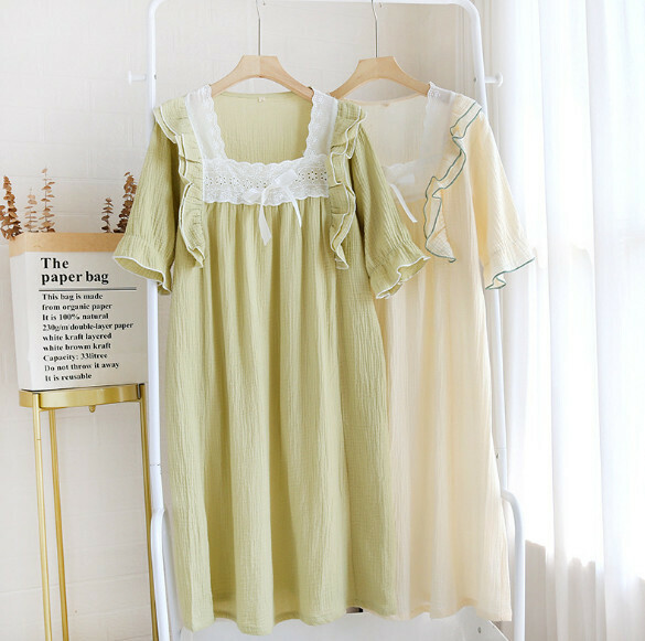 新款夏季蕾絲邊飄帶縐布短袖睡裙(LYZ米白色)【M-XL碼】【下單後聯絡客服確認發貨尺碼】