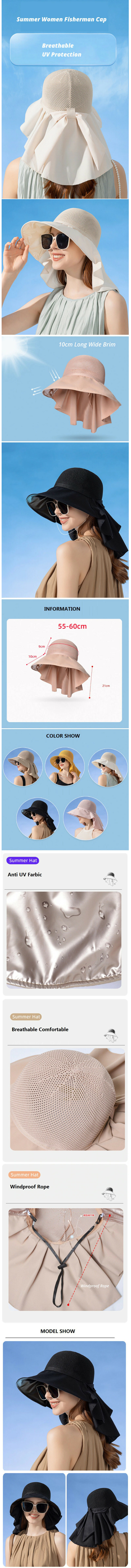 夏季長款寬簷漁夫帽女式蝴蝶結草帽女護頸防紫外線遮陽帽戶外沙灘遮陽帽