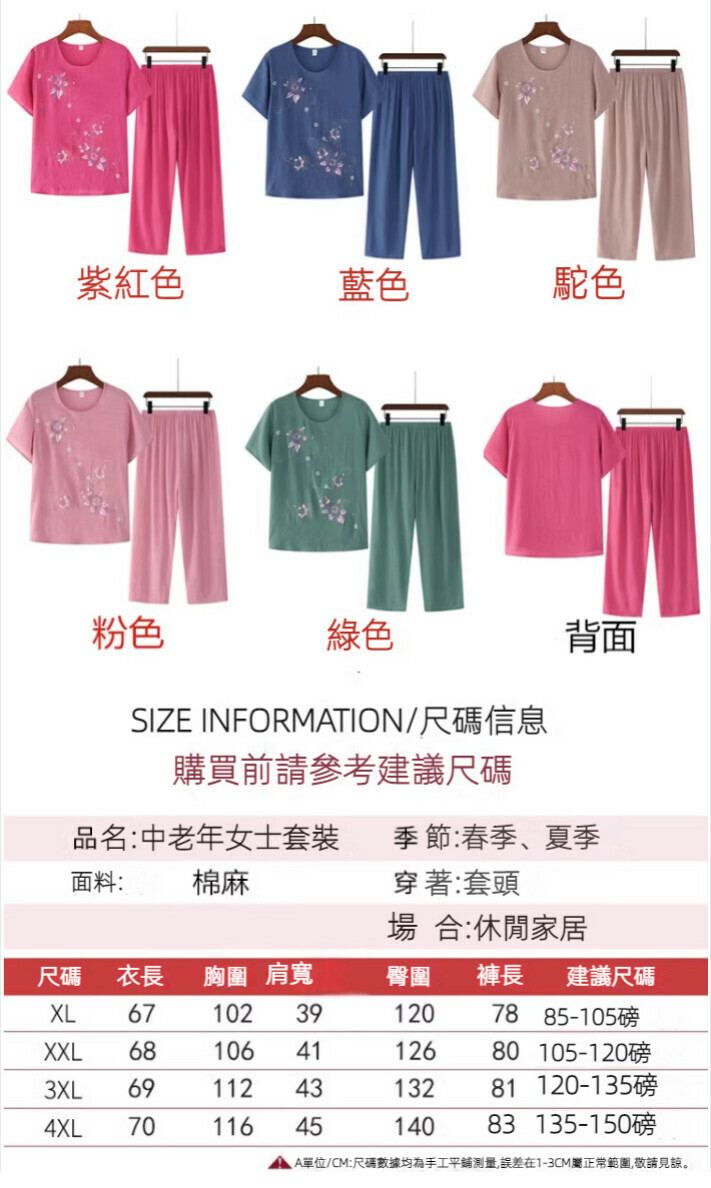 新款夏季中老年棉麻套裝(粉色)【尺碼:XL-4XL】【下單後聯絡客服確認發貨尺碼】