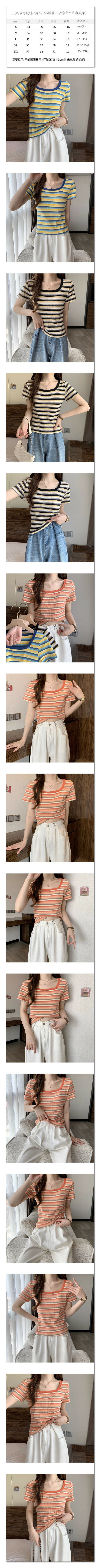 夏季條紋方領短袖t卹(橘色)【尺碼:S-2XL】【下單後聯絡客服確認發貨尺碼】