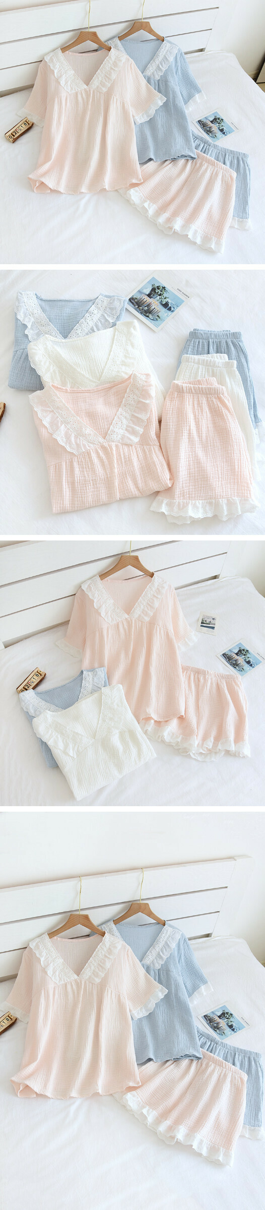 爆款夏季V領蕾絲縐布短褲短袖睡衣套裝(LH藍色)【M-XL碼】【下單後聯絡客服確認發貨尺碼】