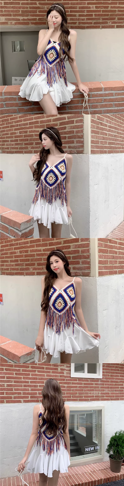 熱賣吊帶波西米亞流蘇背心鏤空針織拼(白色)(均碼)】