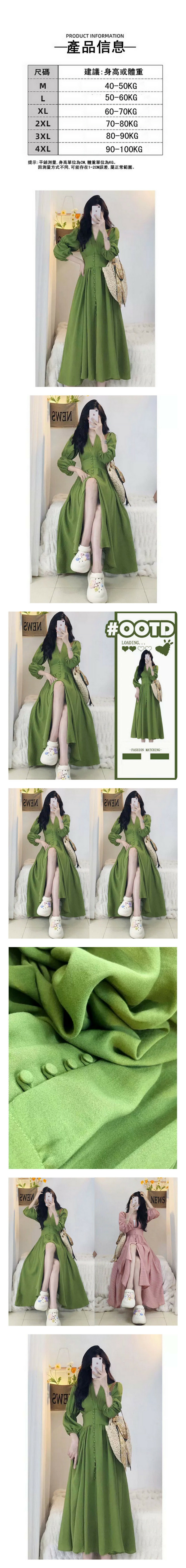 熱賣氣質開叉V領泡泡袖連衣裙#單件(綠色)(M-4XL碼) (下單後聯系客服確認尺碼) #F105034158