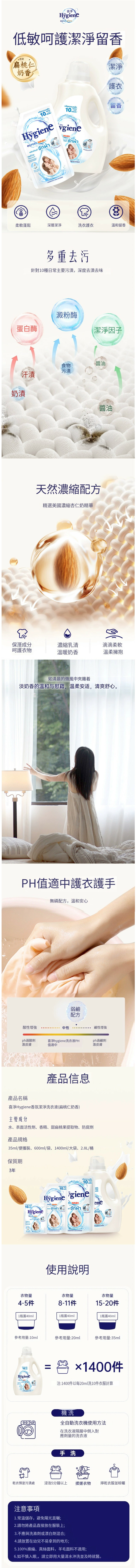 泰國Hygiene--洗衣液防靜電持久留香柔軟【扁桃仁奶香】2800mlx1瓶裝