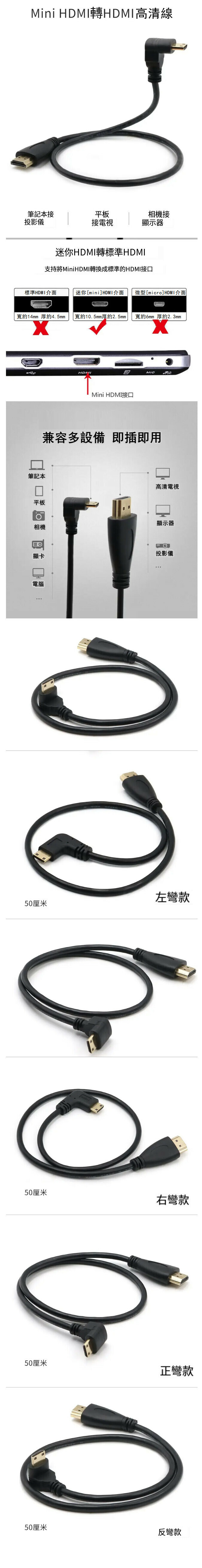 激抵初代mini HDMI轉HDMI線90度彎頭視頻連接線【反彎款】50釐米