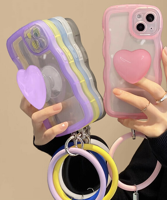 爆款大波浪愛心支架適用OPPO手機殼(果凍粉【愛心支架+手環款】(下單後聯絡客服確認手機型號)