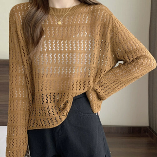 新款薄款鏤空針織衫(焦糖色均碼)
