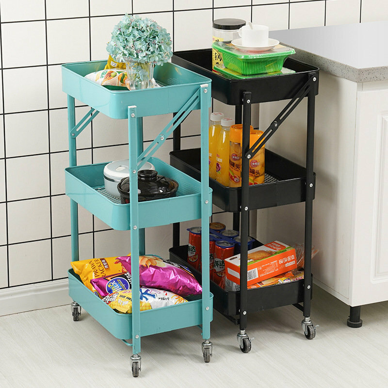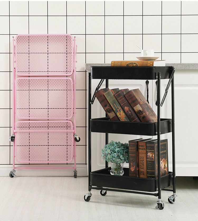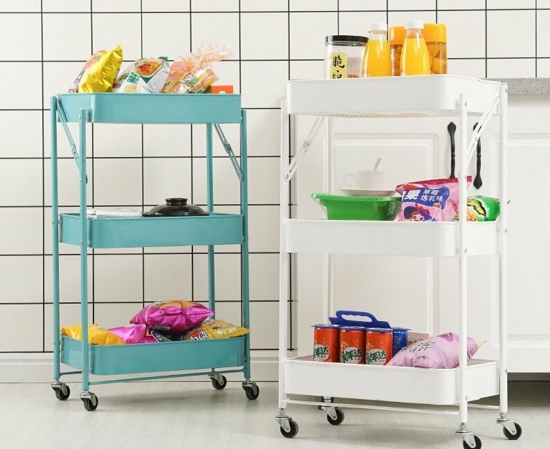 熱推帶滾輪 三層可折疊廚房收納架 廚房小推車 戶外收納車 花園燒烤 小推車 多層收納 儲物 置物架免安裝摺疊移動儲物車(白色)