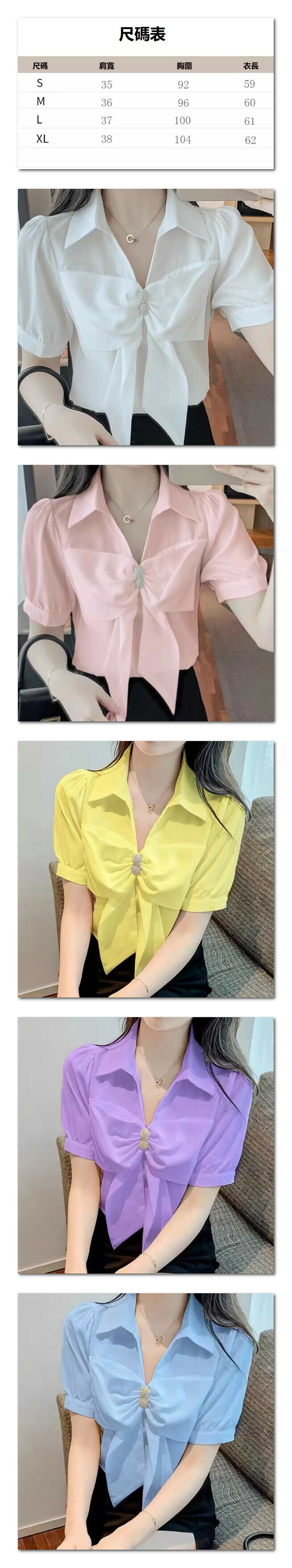 新款V領蝴蝶結減齡短袖襯衫女夏季(白色【S_XL碼】(下單後聯繫客服確認發貨尺碼)】