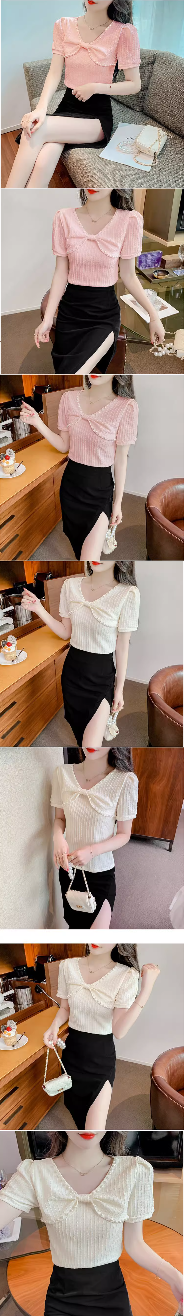 熱賣V領蕾絲短袖上衣(杏色 尺碼:S-3XL)(下單後請聯絡客服確認發貨尺碼)