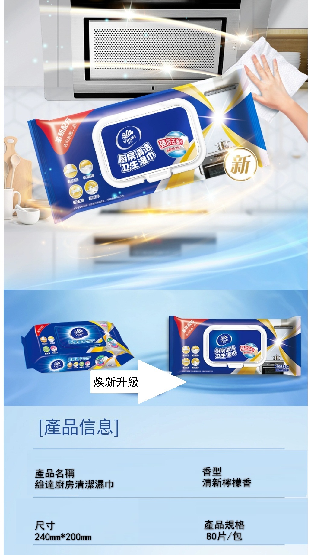 維達廚房濕巾强力去油污殺菌清洗專用擦油濕紙巾家用清潔用紙【80片*3包 新舊包裝隨機發貨】實惠裝