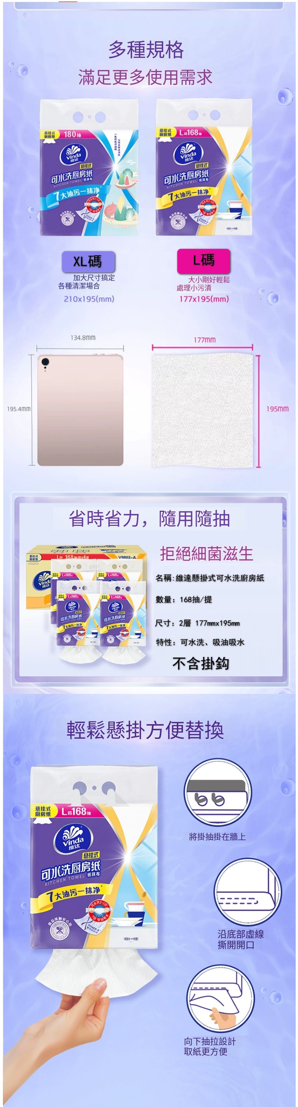 維達(可水洗)廚房專用抽紙大包懸掛式吸油吸水抹布紙巾【168抽x4提 不含掛鈎】L碼