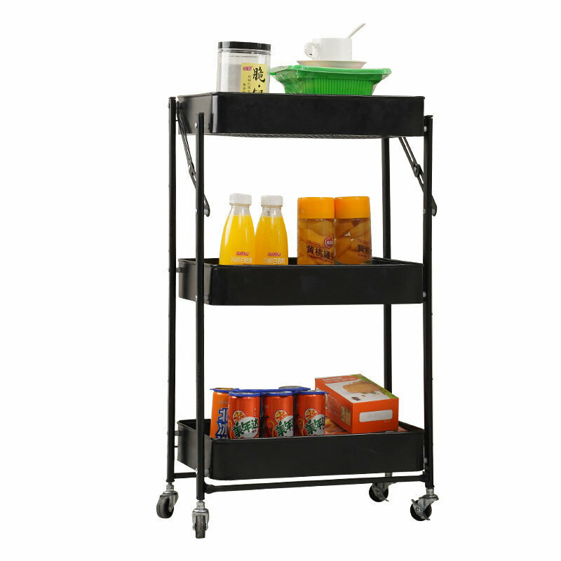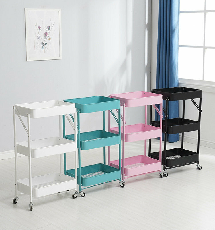 熱推帶滾輪 三層可折疊廚房收納架 廚房小推車 戶外收納車 花園燒烤 小推車 多層收納 儲物 置物架免安裝摺疊移動儲物車(粉色)