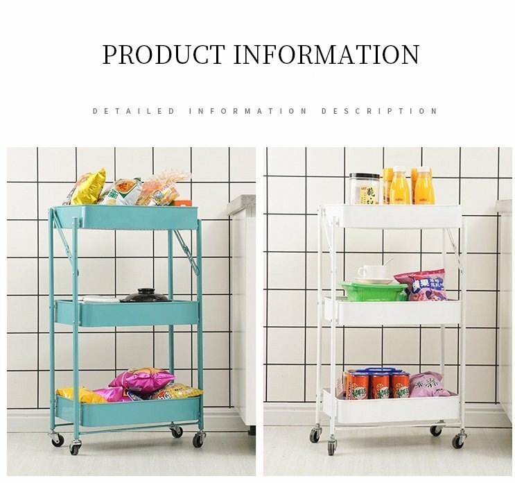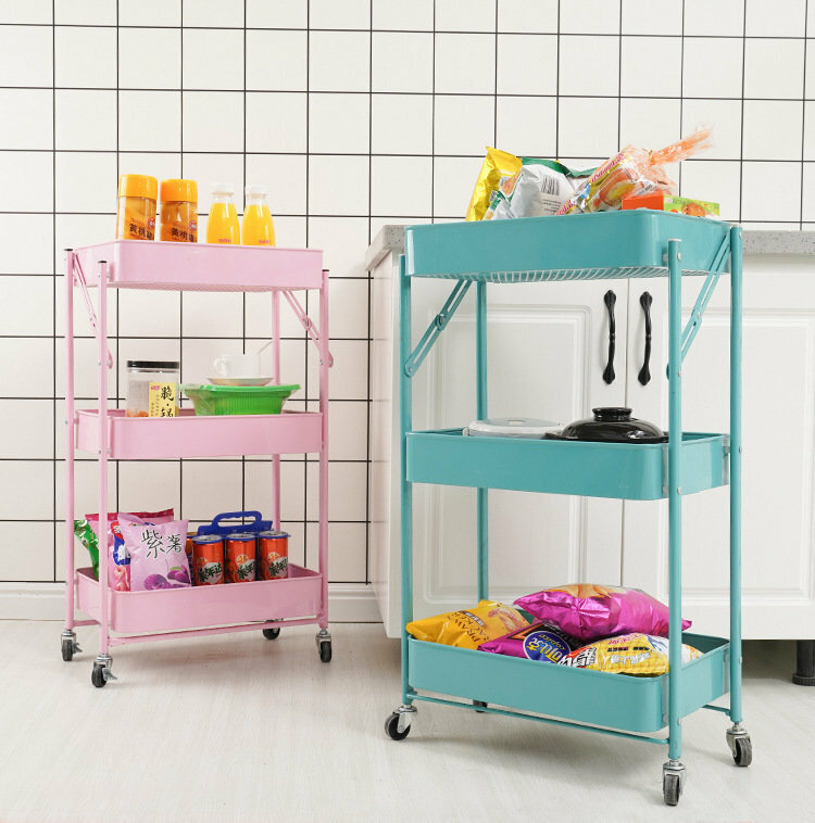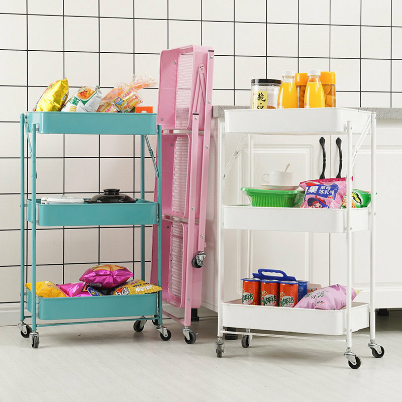 熱推帶滾輪 三層可折疊廚房收納架 廚房小推車 戶外收納車 花園燒烤 小推車 多層收納 儲物 置物架免安裝摺疊移動儲物車(藍色)
