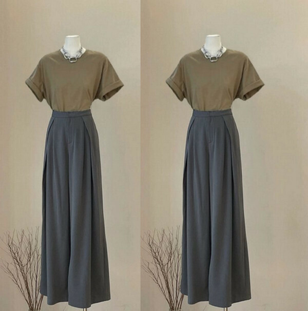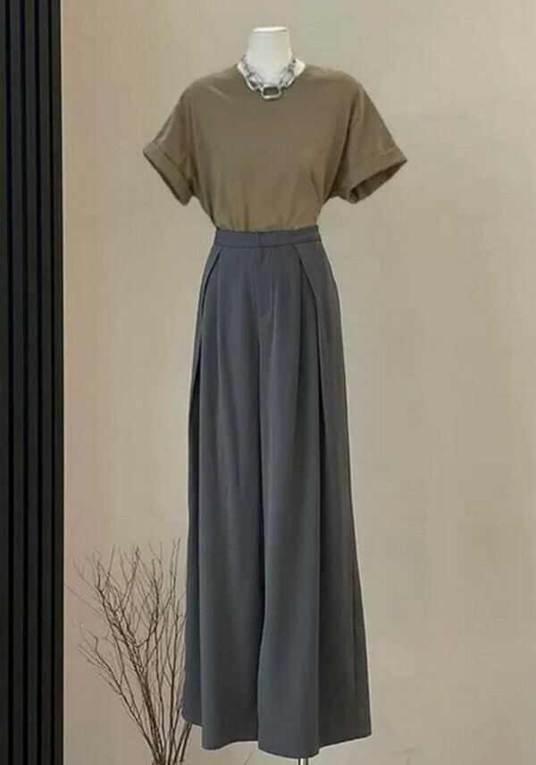 爆款女裝兩件套-圓領T恤短袖+闊腿西裝褲(卡其+灰色)(M-4XL碼) (下單後聯系客服確認尺碼)