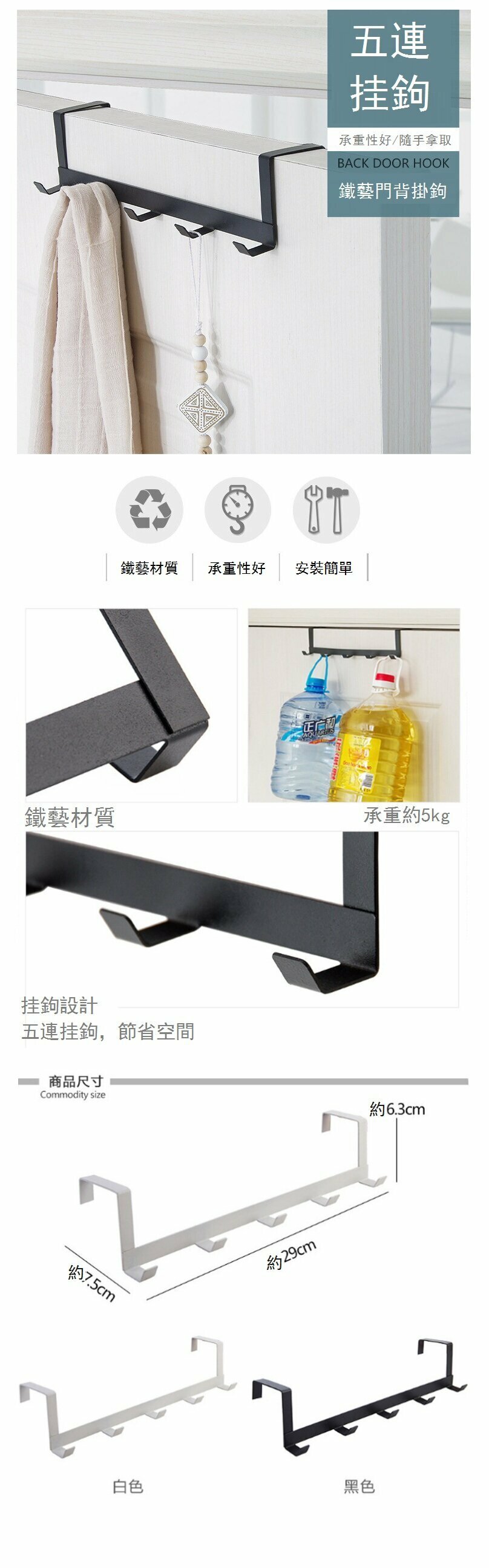 熱推鐵藝5連排掛鉤門後掛鉤(黑色29*7.5*6.3CM)