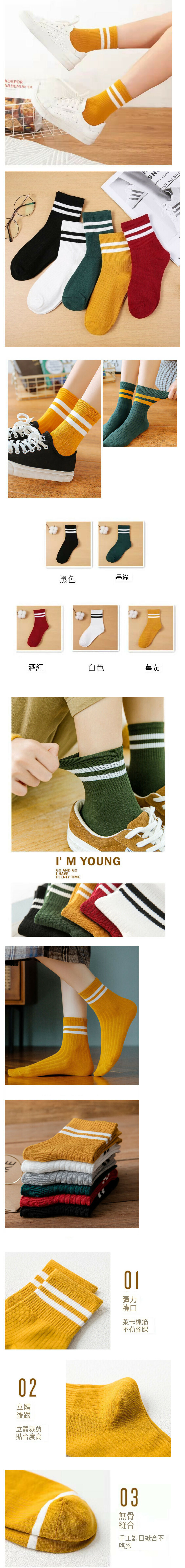 爆款【1對裝 均碼】秋冬季學院風襪【中筒襪 彩色二杠 顔色隨機】