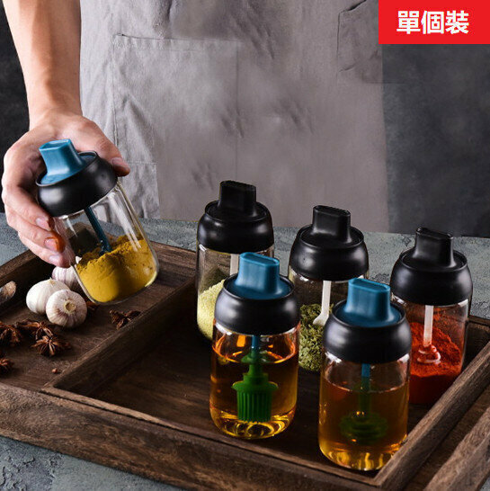 熱賣【黑色刷油瓶/單個裝]】帶匙密封玻璃調味瓶 一體式匙調味罐調味瓶 匙蓋合一 可拆卸好清洗